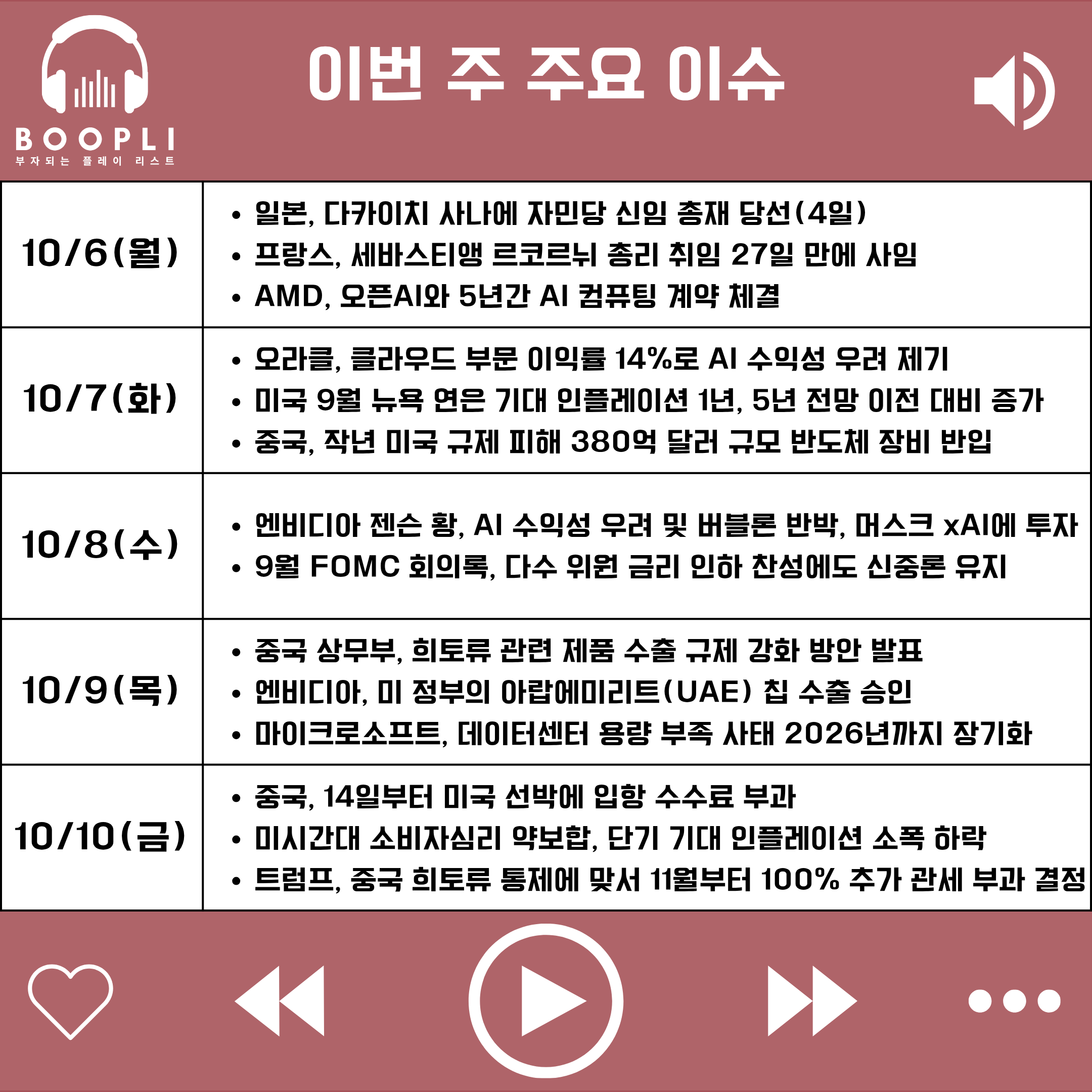 이번 주 증시는 연방 정부 셧다운 지속, 오픈AI의 파트너십 발표와 AMD 칩 공급 계약, 오라클 수익성 우려, 중국의 희토류 규제 강화, 트럼프의 대중 관세 강화 발언 등 이슈에 따라 차별적인 모습을 보였다.