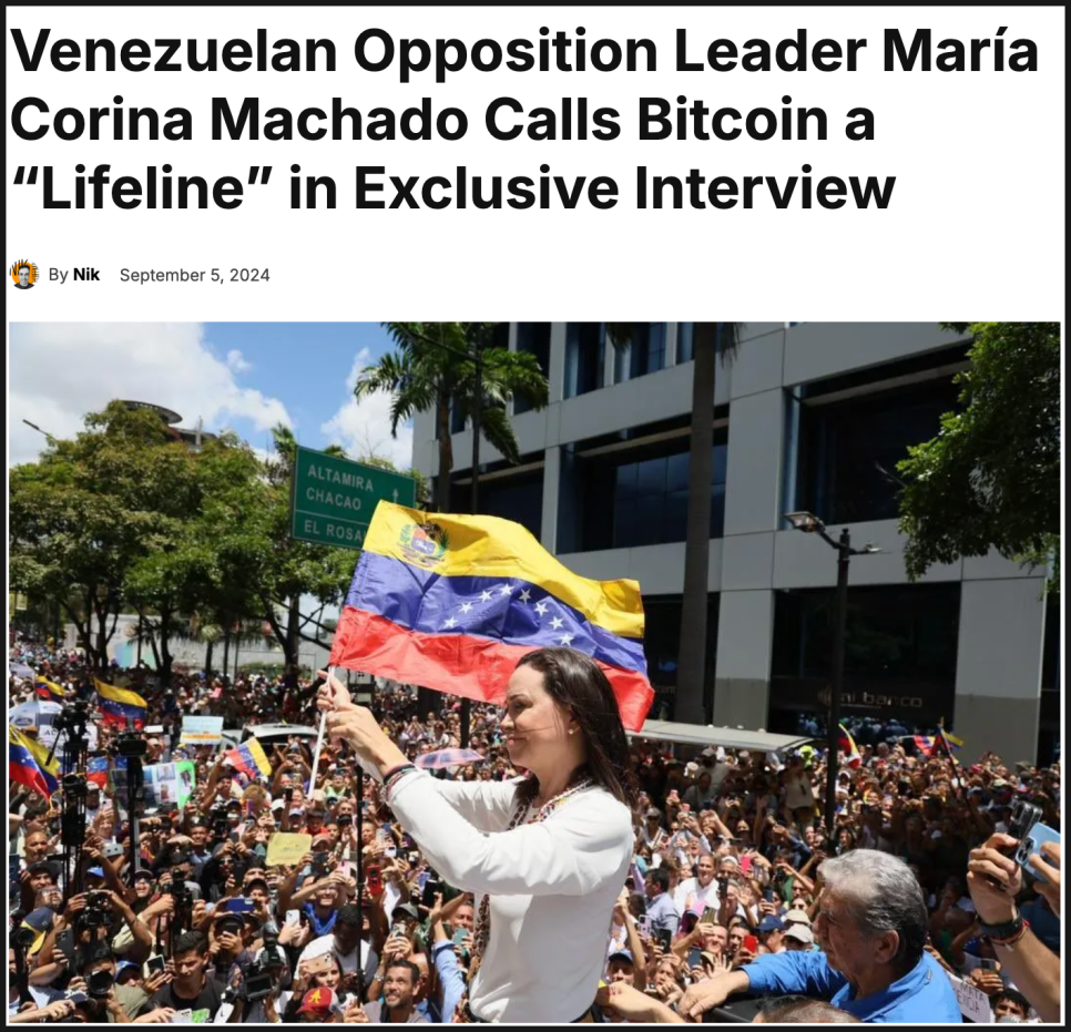 2024년 비트코인 매거진(Bitcoin Magazine)과의 인터뷰에서 마차도는 비트코인이 베네수엘라 국민들에게 어떤 의미였는지를 설명했습니다. 오랜 기간 초인플레이션에 시달려온 베네수엘라에서는 자국 화폐의 가치가 급격히 떨어지면서 일상적인 경제활동조차 불가능해졌습니다. 많은 사람들이 자산을 지키고 생존하기 위해 비트코인을 활용하기 시작했죠. 투자가 아니라 생존 수단이었습니다.