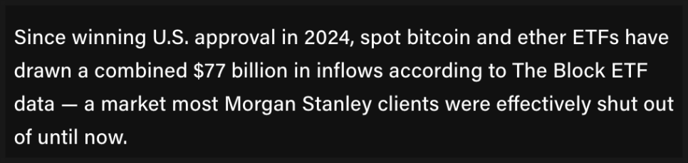 참고로 ETF(상장지수펀드)는 투자자가 직접 암호화폐를 보관하지 않고도 코인 가격에 투자할 수 있는 상품입니다. 미국에서 2024년 비트코인과 이더리움 ETF가 승인된 이후 지금까지 약 770억 달러 규모의 자금이 유입됐습니다. 여기에 모건스탠리 고객까지 합류한다면 자금 규모는 훨씬 커질 수밖에 없습니다.