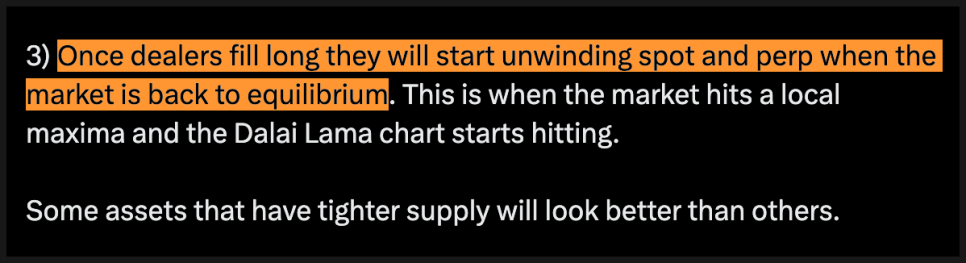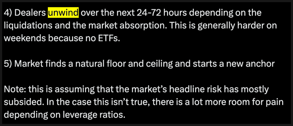 세 번째는 ‘딜러 언와인드(dealer unwind)’입니다. 폭락 당시 낮은 가격에 매수한 포지션을 점진적으로 되파는 과정인데요. 마켓 메이커들은 한 번에 팔지 않습니다. 그렇게 하면 다시 가격이 급락할 수 있기 때문이죠. 특히 ETF 시장이 문을 닫는 주말에는 유동성이 얇아지기 때문에 이 과정이 더 느려질 수밖에 없습니다.