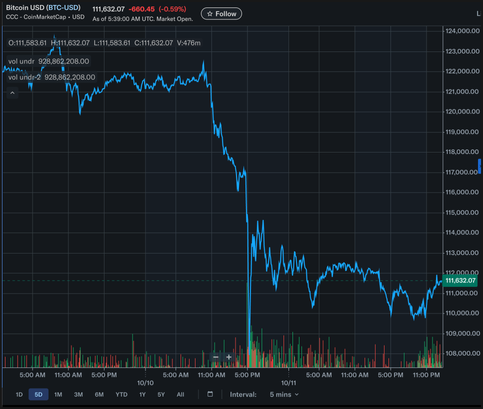 이러한 패턴을 염두에 두고 최근 비트코인 차트를 봐볼까요. 가장 눈에 띄는 지점은 10월 10일 저녁 시간대에 발생한 급격한 낙폭입니다.