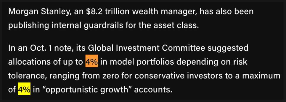 모건스탠리는 블랙록(BlackRock), 피테딜리티(Fidelity Investments)와 같은 기관의 ETF 상품을 통해 고객들에게 암호화폐 투자 기회를 제공합니다. 내부 투자위원회는 공격적인 포트폴리오 기준으로 최대 4%까지 암호화폐 자산을 편입할 수 있다고 권고했는데요. 이런 움직임은 암호화폐가 전통 금융의 ‘공식 자산군’으로 점점 편입되고 있다는 신호로 받아들여집니다.