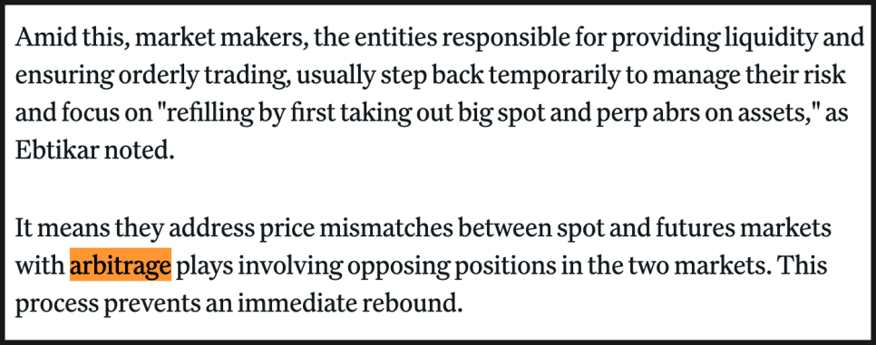 이때 현물(spot) 시장과 선물(futures) 혹은 무기한(perpetual) 시장 사이의 가격 차이가 커집니다. 이 차이를 이용해 마켓 메이커와 기관 투자자들은 ‘차익거래(arbitrage)’를 통해 균형을 맞추려는 움직임을 시작합니다. 한쪽 시장에서 싸게 사고 다른 쪽에서 비싸게 파는 방식인데요. 이 작업이 진행되는 동안 시장은 쉽게 반등하지 않습니다. 시간과 체력이 필요한 과정입니다.