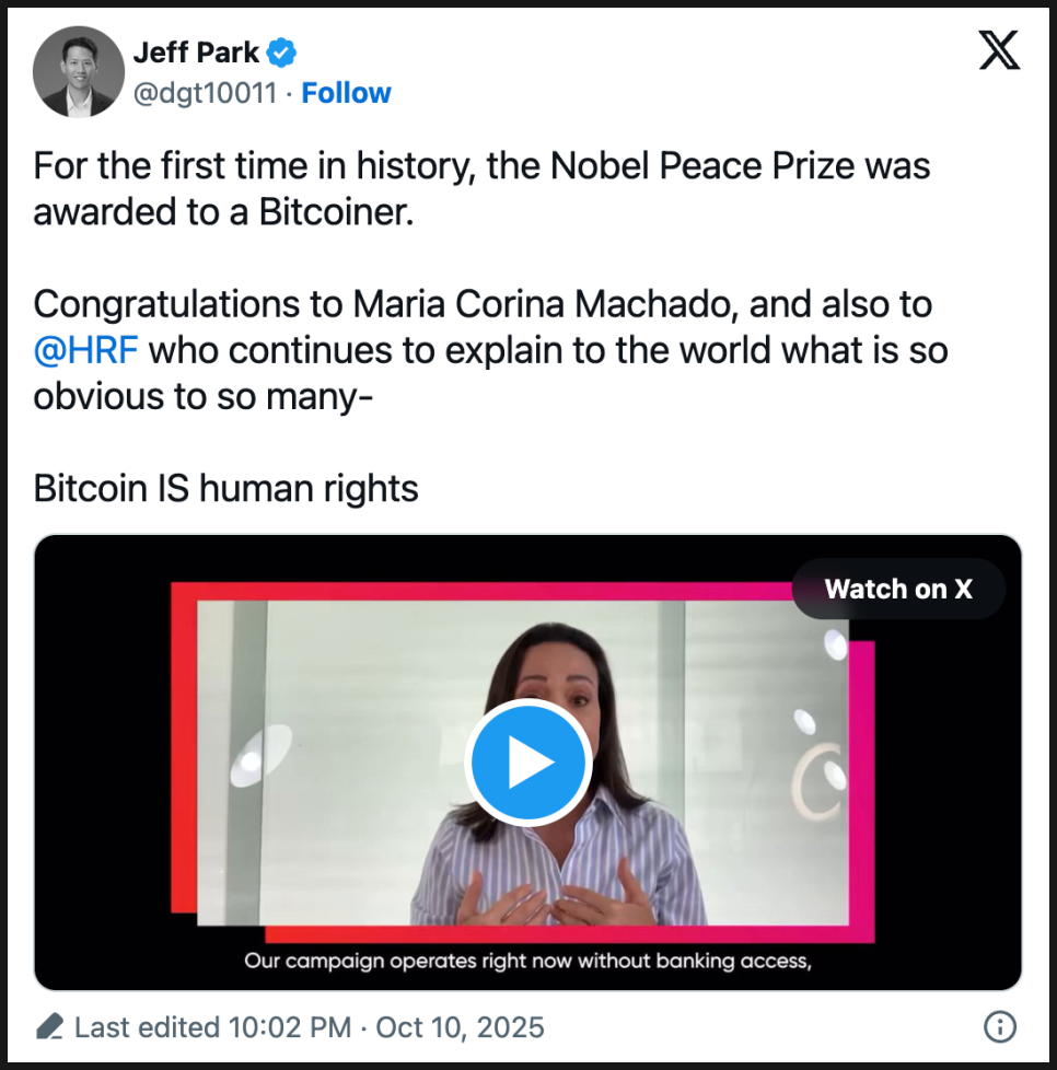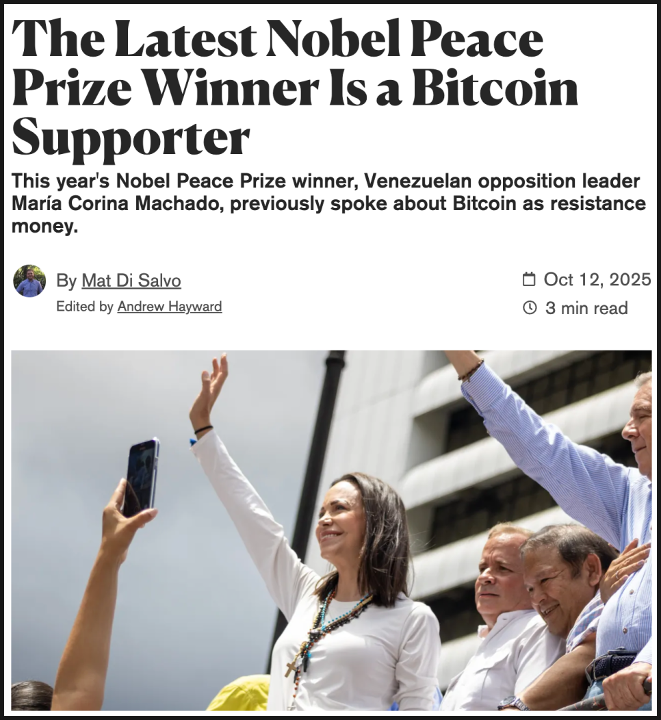 시장이 충격을 소화하고 있는 와중에, 전혀 다른 영역에서 비트코인의 이름이 전 세계 뉴스 헤드라인에 등장했습니다. 올해 노벨 평화상(Nobel Peace Prize) 수상자는 베네수엘라의 야권 지도자 마리아 코리나 마차도(María Corina Machado)였는데요. 그녀는 과거 인터뷰에서 비트코인을 “저항의 수단”이라고 표현한 인물입니다.
