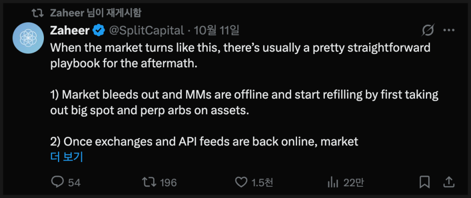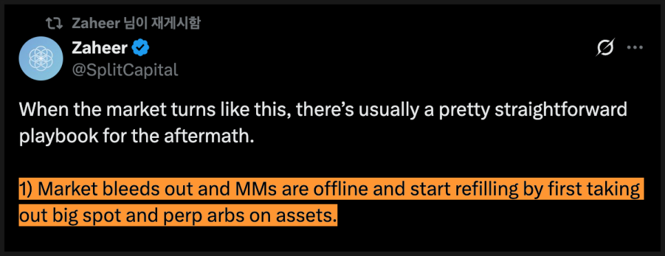 스플릿 캐피털(Split Capital)의 자히르 엡티카르(Zaheer Ebtikar) 최고투자책임자에 따르면, 이런 급락 직후에는 비교적 일정한 패턴이 반복된다고 합니다. 시장 유동성을 공급하는 참여자들과 거래 인프라, 그리고 투자자 행동이 맞물리면서 자연스럽게 생기는 흐름이 나타난다는 건데요.
