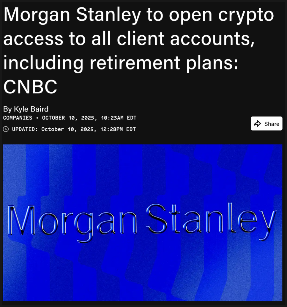 이 와중에 전통 금융 시장에서도 중요한 변화가 있었습니다. 모건 스탠리(Morgan Stanley)가 10월 15일부터 전 고객에게 암호화폐 펀드 접근을 허용하겠다고 발표한 겁니다. 지금까지는 최소 150만 달러(약 21억 원) 이상의 자산을 보유하고 높은 위험 선호도를 가진 일부 고객만 비트코인이나 이더리움 펀드에 투자할 수 있었습니다. 하지만 앞으로는 은퇴 연금 계좌를 포함해 훨씬 더 넓은 투자자층이 접근할 수 있게 됩니다.