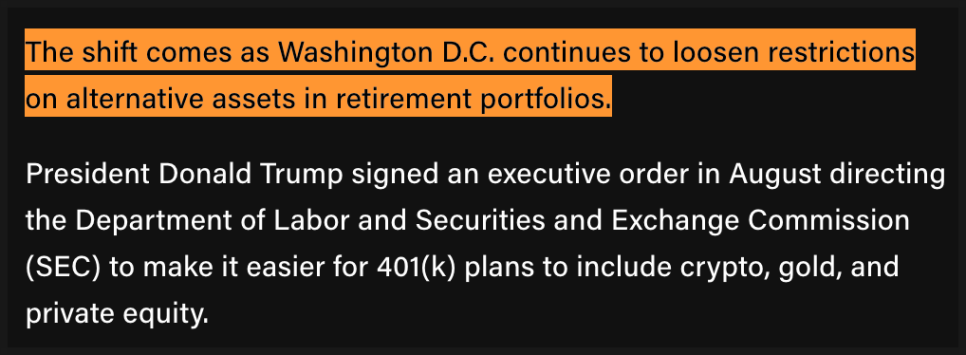 이 결정에는 미국 정부의 정책 변화가 큰 영향을 미쳤습니다. 올해 여름 미국 행정부는 퇴직연금 계좌가 암호화폐, 금, 사모펀드와 같은 대체자산에 투자할 수 있도록 규제 완화를 지시하는 행정명령을 발표했습니다. 이 조치로 인해 암호화폐를 포함한 자산 편입의 법적 리스크가 줄어들었고, 모건스탠리와 같은 대형 금융기관이 본격적으로 시장에 발을 들여놓게 된 겁니다.