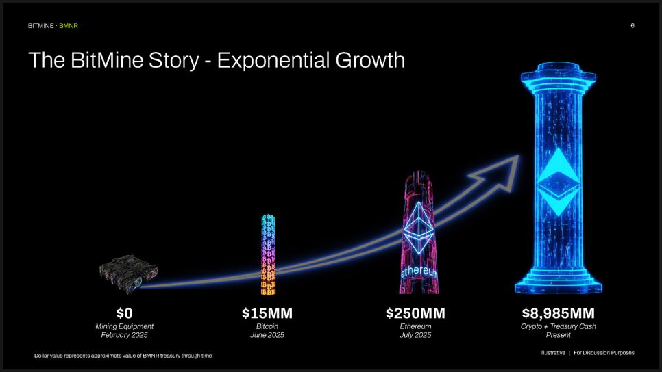 그전에 빠르게 기업 리뷰 먼저 해보자면, 비트마인 이머션 테크놀로지스(BMNR)는 원래 소규모 비트코인 채굴 회사였지만, 2025년에 전면적인 전략 전환을 선언했습니다. 채굴 사업 대신, 대규모 이더리움(ETH)을 매입해 보유하는 전략을 택한 것이죠.