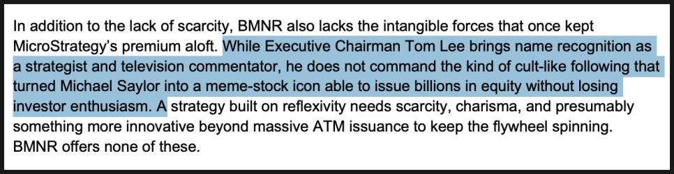 반면 케리스데일은 톰 리(Tom Lee)가 시장에서 잘 알려진 인물이긴 하지만, 마이클 세일러(Saylor) 수준의 ‘컬트적 영향력’을 만들기에는 역부족이라고 평가하고 있습니다. DAT 모델은 신뢰와 서사가 결합될 때만 작동력이 생기는데, BMNR은 이 부분에서 약점이 있다고 주장하는 겁니다.
