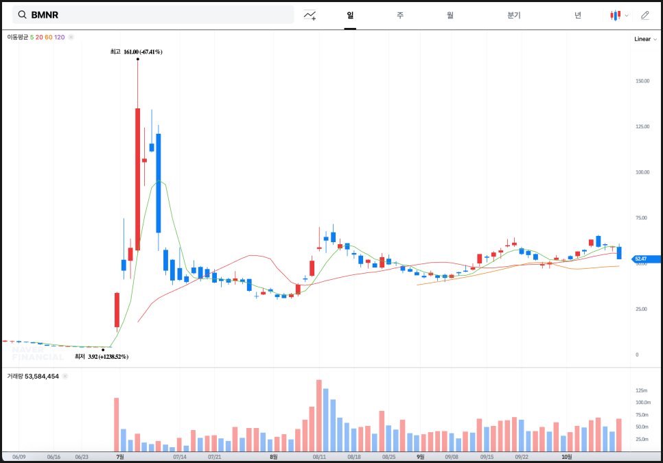 BMNR 주가 일봉 차트를 보면 6월 말~7월 초 사이에 폭발적인 상승이 발생했습니다. 최저 3.92달러에서 최고 161달러까지 약 1개월도 안 되는 기간에 40배 가까운 급등이 나타났습니다. 이 구간은 회사가 본격적으로 ETH 트레저리 전략을 시장에 내세우면서 투자자들이 ‘두 번째 MSTR’로 받아들였던 기대감이 집중 반영된 시기로 보입니다.