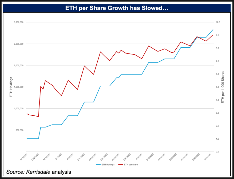 불과 3개월 만에 100억 달러 이상을 조달하고, 2억 4천만 주 이상의 주식을 발행했습니다. 이로 인해 ETH 총 보유량은 급격히 증가했지만, 1주당 ETH 보유량의 증가율은 현저히 둔화됐습니다.