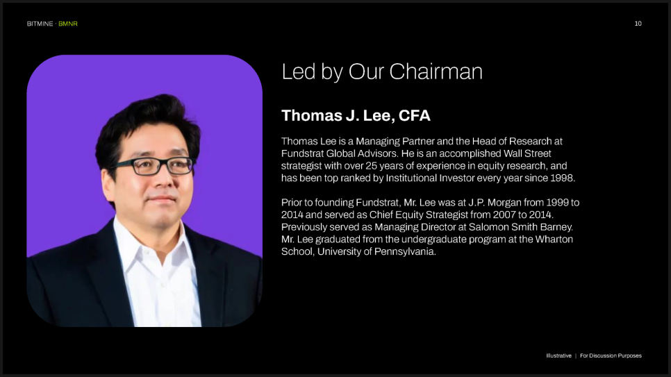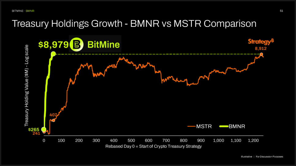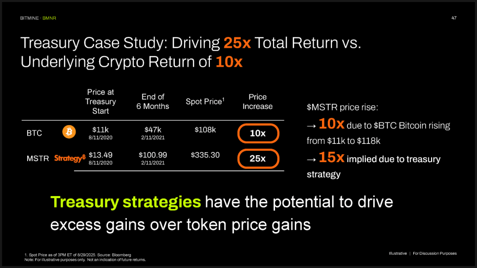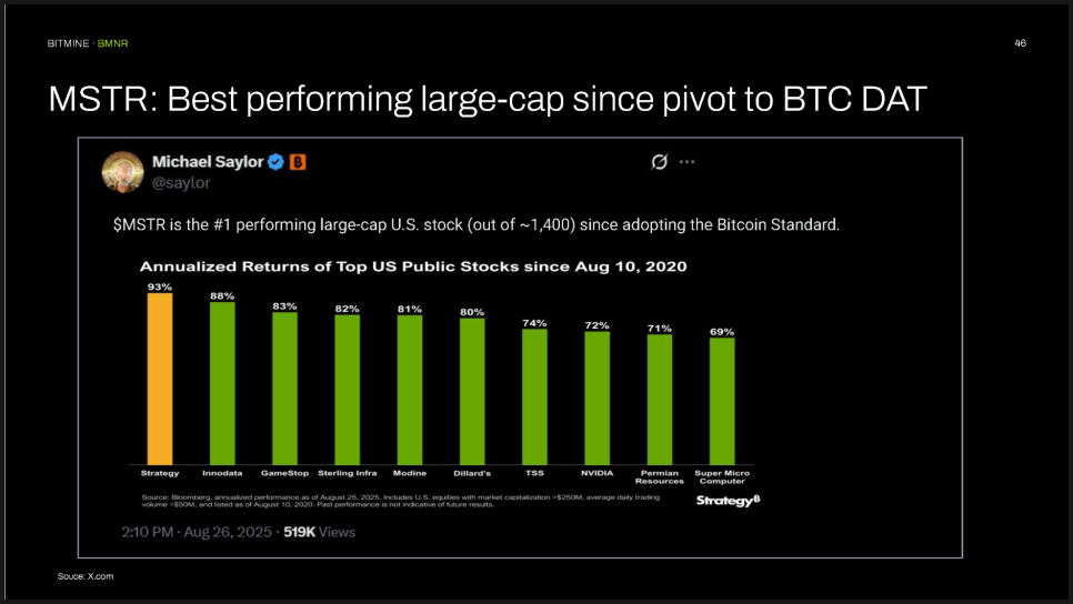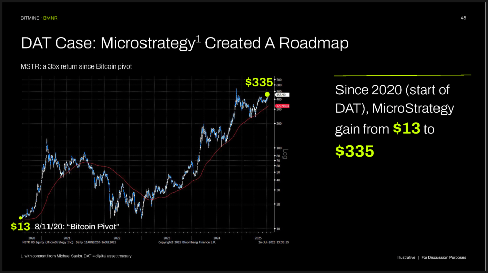 이 전략은 유명한 비트코인 신봉자 마이클 세일러의 리더십 아레 스트래티지(MSTR / Strategy)가 비트코인을 매입하며 시장에서 폭발적인 주가 상승을 이끌었던 방식과 유사합니다. 그리고 비트마인 이머션은 이러한 유사성을 숨기지 않고 오히려 회사소개서 IR 자료에서 이를 당당히 밝히고 있습니다.