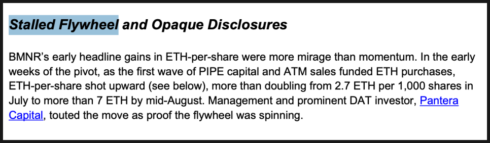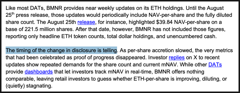 케리스데일은 이 변화를 1주당 보유 이더리움 수량 증가율이 둔화되는 시점에 맞춘 의도적 축소라고 해석하고 있습니다. 이러한 정보 축소는 DAT 모델에서 핵심인 ‘주당 자산 성장’에 대한 신뢰를 흔들 수 있다는 게 그들의 주장입니다.