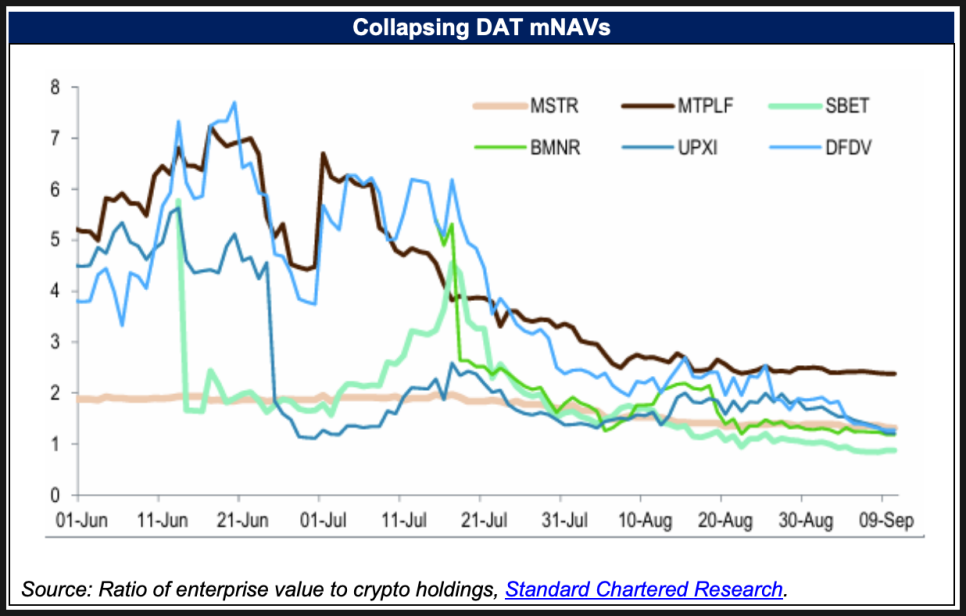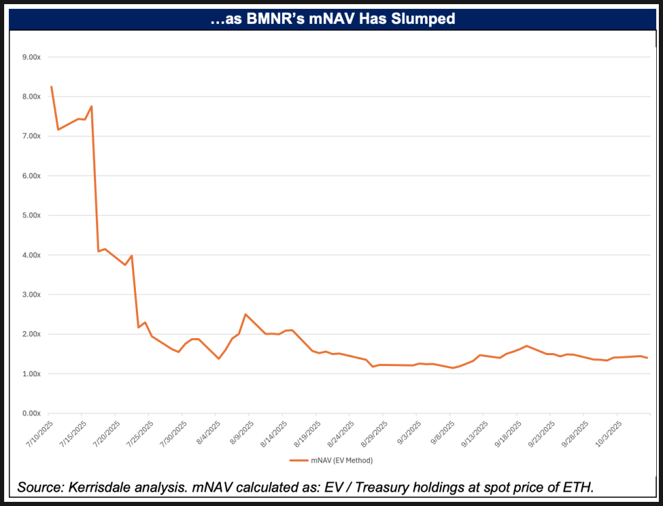 케리스데일은 비트마인(BMNR)의 프리미엄이 이미 2배 수준에서 1.2배까지 떨어졌고, 이 순환이 끊어지고 있다고 해석합니다.