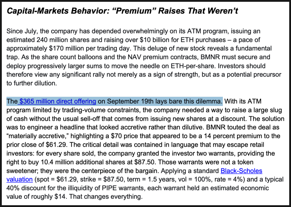 둘째, 9월에 진행된 3억 6,500만 달러 규모의 ‘프리미엄 발행’ 역시 실질적으로는 할인 발행이었다고 주장합니다. 이는 발행 당시 함께 제공된 워런트(미래에 정해진 가격으로 주식을 살 수 있는 권리)의 경제적 가치를 고려했을 때, 실제 발행 가격이 표면 가격보다 훨씬 낮아졌다는 계산에 근거한 겁니다.