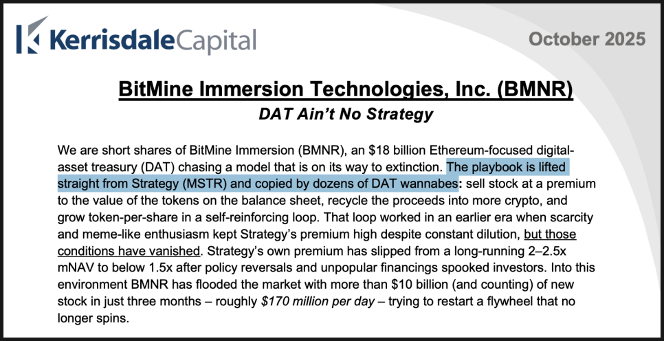 케리스데일의 공매도 보고서 제목은 “DAT Ain’t No Strategy”, 즉 “DAT는 전략이 아니다”라는 메시지를 전면에 내세우고 있습니다.