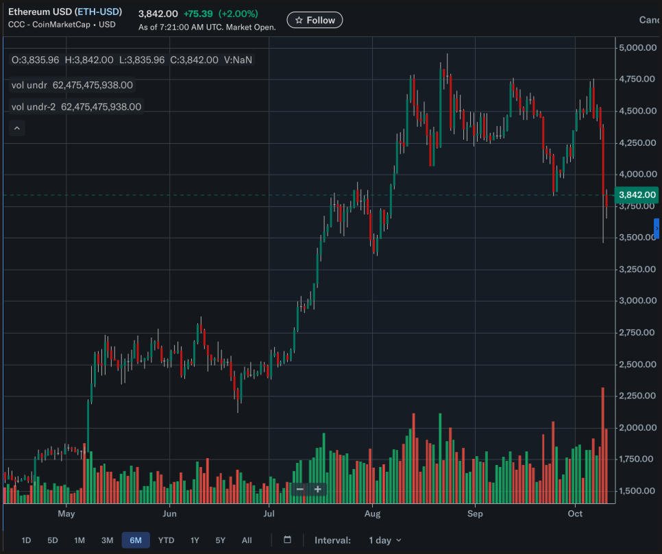 같은 기간 이더리움 차트를 보면 상황이 BMNR과는 조금 다릅니다. ETH는 5월 중순 이후 꾸준한 상승세를 이어가며 8월에 4,700달러 부근까지 도달했습니다. 이후 변동성은 있었지만 장기 상승 추세를 유지한 채 박스권에서 등락을 반복하는 모습입니다.