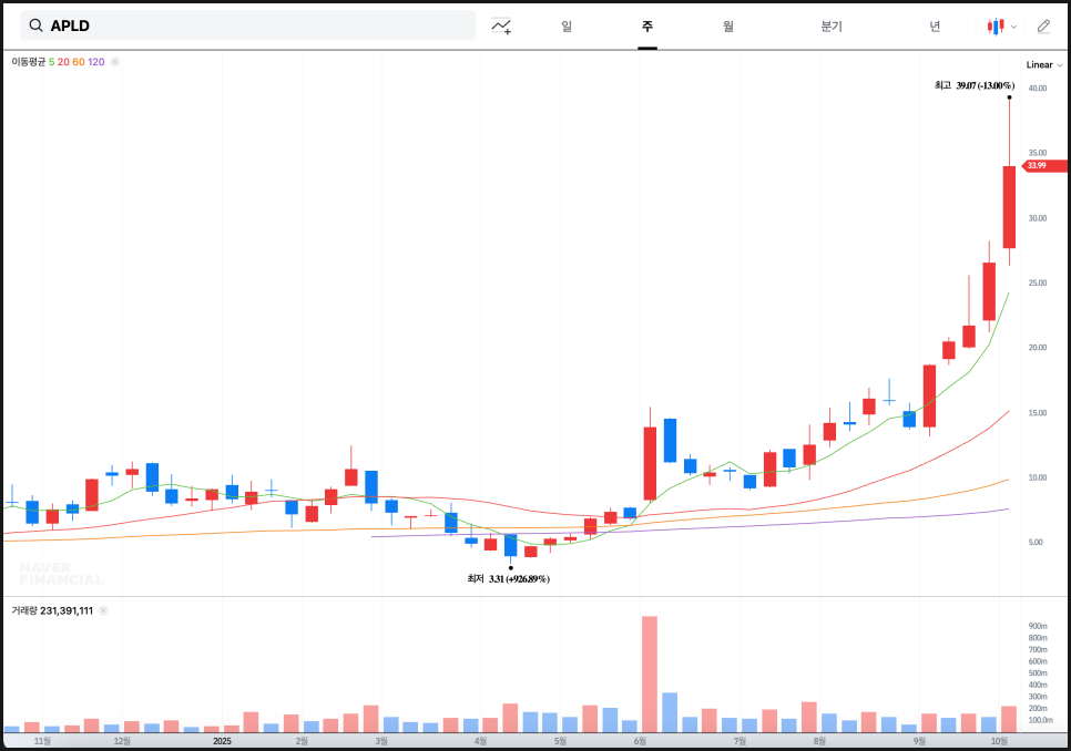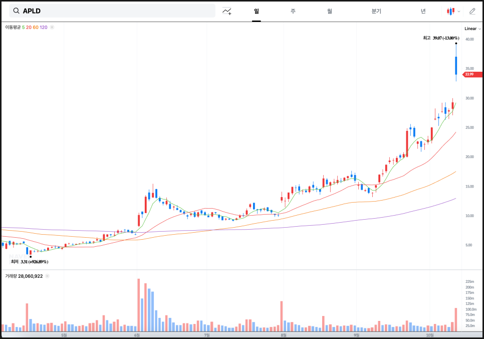 현재 APLD 주가 일봉 차트를 보면 단기 이동평균선(5일선)이 중·장기선(20일, 60일, 120일선) 위로 정렬된 강한 상승 추세가 뚜렷합니다. 이런 정배열 구간에서는 단기 조정이 나와도 매수세가 쉽게 유입되는 경향이 있습니다. 실제로 10월 들어 거래량이 뚜렷하게 늘어났고, 주가는 단기간에 30달러 중반대까지 치솟은 뒤 잠시 숨 고르기에 들어간 모습입니다.