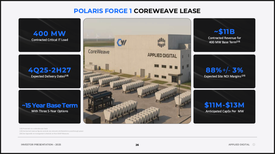 이번 분기의 핵심은 단연 코어위브(CoreWeave)와의 계약입니다. CoreWeave는 엔비디아(NVIDIA Corporation)와도 밀접한 관계를 맺고 있는 초대형 AI 클라우드 기업으로, Applied Digital의 폴라리스 포지 1 캠퍼스 400MW 전량을 임대하기로 했습니다.