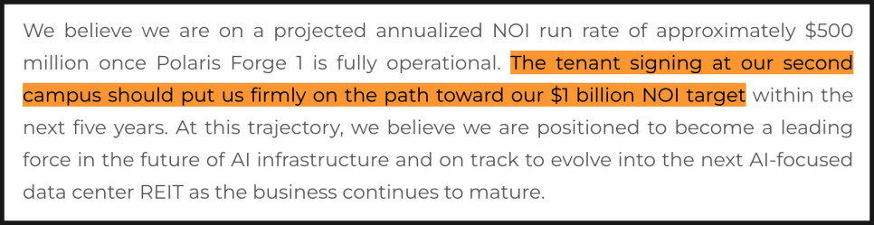폴라리스 포지 1 캠퍼스의 CoreWeave 임대만으로도 연간 NOI 5억 달러 수준이 예상되며, 폴라리스 포지 2와 추가 캠퍼스가 본격 가동되면 목표 달성이 가능하다는 계산입니다. 회사는 장기적으로 데이터센터 리츠(REIT) 모델로 전환하는 그림도 그리고 있습니다.
