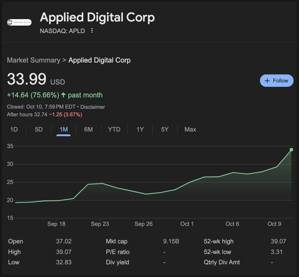 지난 한 달 간 APLD 주가는 70% 이상 상승했는데, 특히 새로운 분기 실적을 발표한 뒤 두 자릿 수 급등을 했습니다.