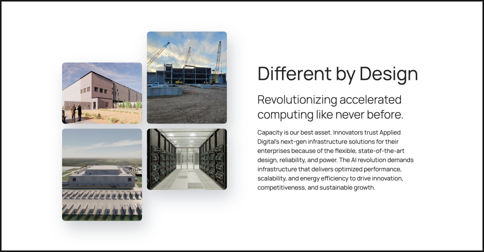 최근 흐름과 실적 내용을 살펴보기 전에 , 빠르게 기업 리뷰 먼저 해보겠습니다. 어플라이드 디지털(Applied Digital)은 미국 기반의 데이터센터 운영 기업입니다. 원래는 암호화폐 채굴 호스팅으로 시작했지만, 지금은 AI와 고성능 컴퓨팅(HPC) 분야를 겨냥해 빠르게 사업을 전환하고 있죠.