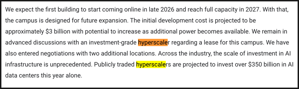 단일 고객으로부터 110억 달러 규모의 장기 계약을 확보했고, 공사 기간을 절반으로 줄였으며, 공급망을 선점해 납기 리스크를 낮췄고, 50억 달러의 자금으로 250억 달러 규모 확장의 길을 열면서 AI 인프라 확장 전쟁의 전면에 뛰어들고 있음을 보여주었습니다.