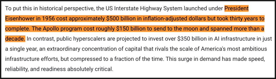 웨스 커민스 CEO는 이번 실적 발표에서 AI 인프라 투자를 미국 역사상 가장 큰 인프라 투자 프로젝트들과 비교했습니다.