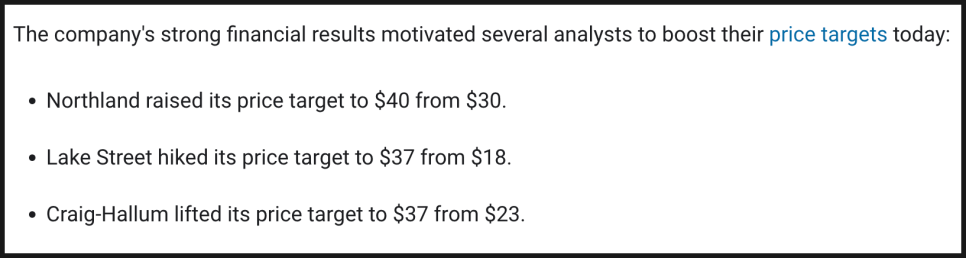 이러한 결과에 힘입어, 여러 증권사가 일제히 목표주가를 상향 조정했습니다. Northland Capital Markets는 목표가를 기존 30달러에서 40달러로 상향했고, Lake Street Capital Markets는 18달러에서 37달러로, Craig-Hallum Capital Group 역시 23달러에서 37달러로 상향했습니다.
