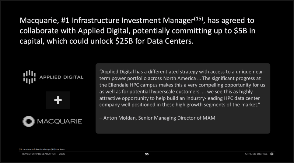 한편 최근 어플라이드 디지털은 Macquarie Asset Management와의 협력을 통해 50억 달러 규모의 우선주 투자 약정을 체결했습니다. 우선주는 기존 주주 지분을 즉각 희석시키지 않으면서 자금을 조달할 수 있는 방식입니다.