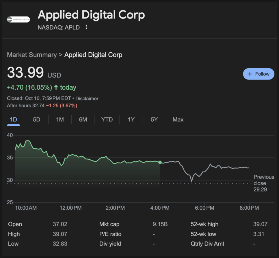 2025년 10월 13일 다룰 종목은 바로 어플라이드 디지털(APLD)입니다.