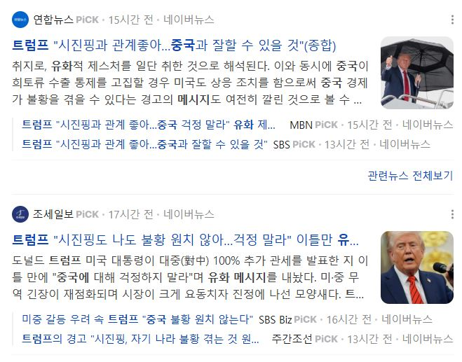 트럼프의 중국 100% 관세 부과 예고한지 이틀이 지난 12일 “중국에 대해 걱정하지 말라”라 유화 메시지를 소셜미디어 트루스소셜을 통해 밝혔습니다.
