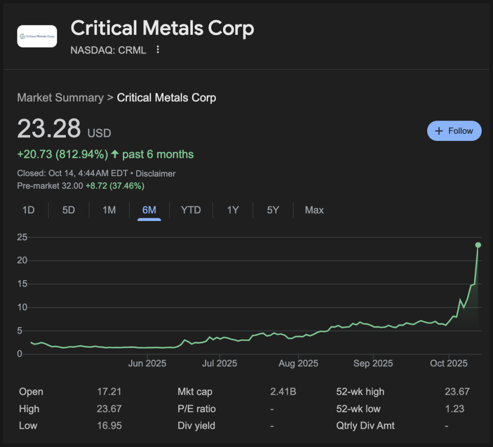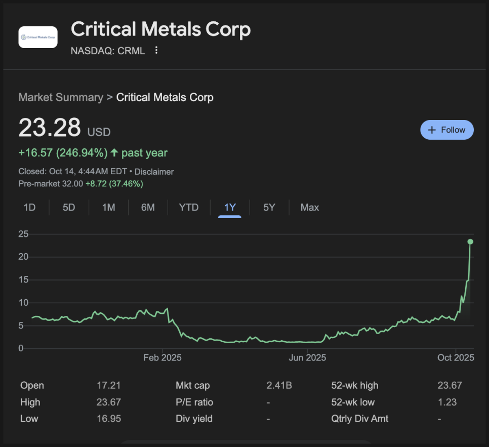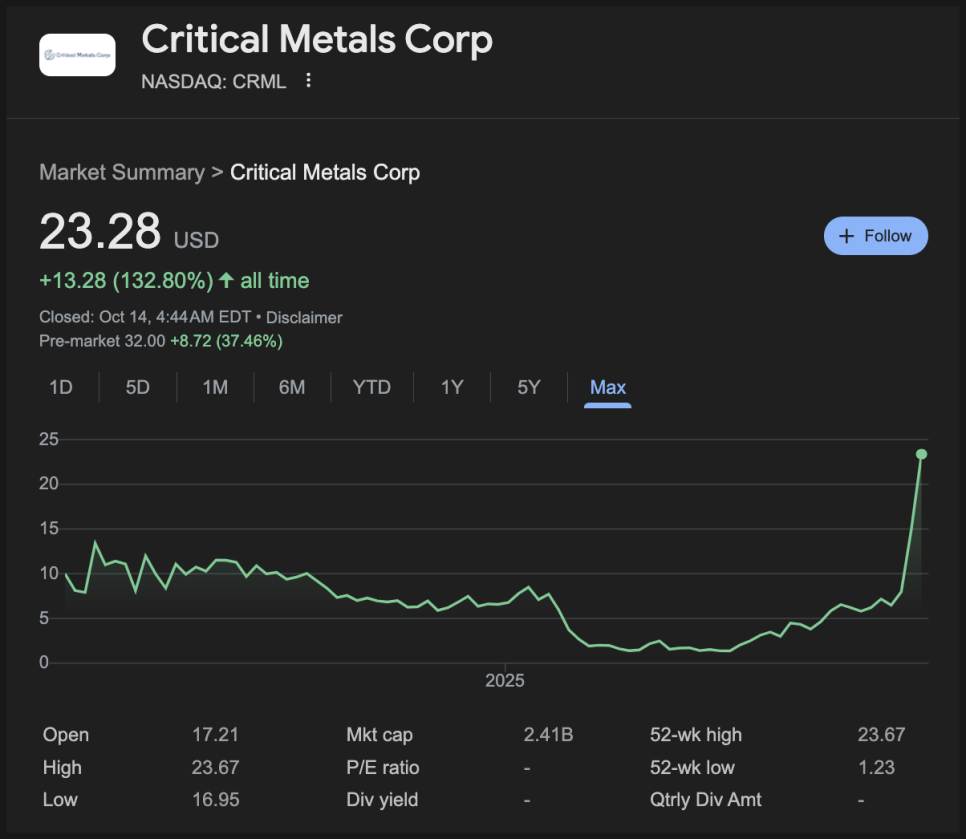 엠피 머터리얼즈(MP Materials Corp) 주가도 급등했기 때문에, 크리티컬 메탈스(Critical Metals Corp)에도 발빠르게 달려들고 있다고 보시면 되겠습니다.