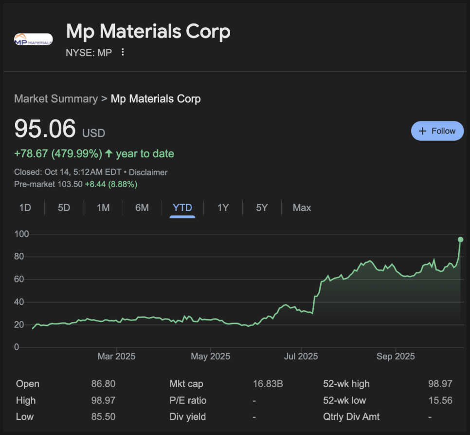 게다가 최근 중국이 희토류 수출 규제를 확대한 직후, 트럼프 대통령이 중국산 제품에 100% 관세를 부과하겠다고 경고한 일이 있었는데 이것 때문에 희토류 기업이 더 이슈가 됐었죠.