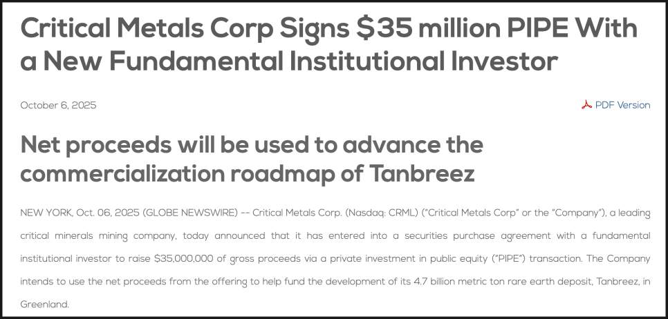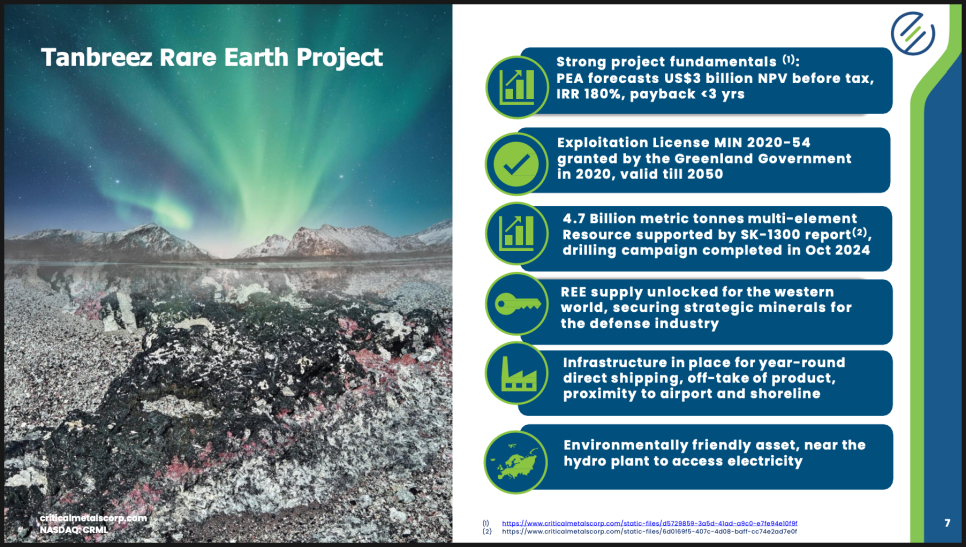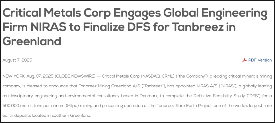 이런 환경 속에서 Tanbreez를 보유한 크리티컬 메탈스는 공급망 전략의 한 축으로 주목받고 있습니다. 더 흥미로운 건 이 광산이 이미 과거 중국의 인수 시도 대상이었다는 점입니다. 당시 중국 기업이 더 높은 금액을 제시했지만, 미국의 외교적 개입으로 CRML이 인수에 성공했습니다. 사실상 이 프로젝트는 이미 이전부터 미·중 희토류 경쟁의 전선에 있었던 셈이죠.