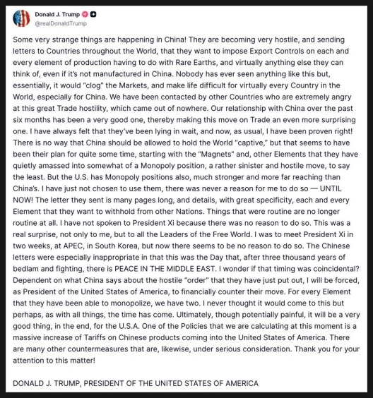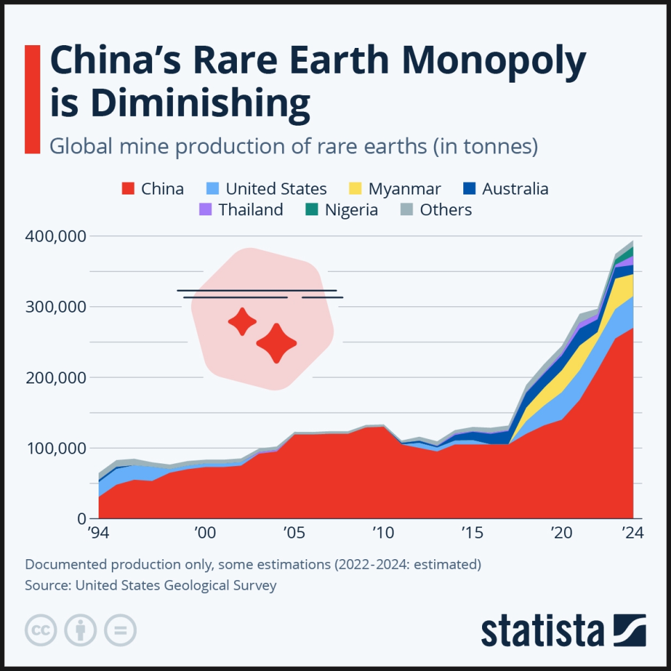 중국은 희토류 정제와 자석 생산에서 압도적인 우위를 가지고 있기 때문에, 이런 수출 조치는 사실상 경제적 무기로 작용할 수 있습니다.