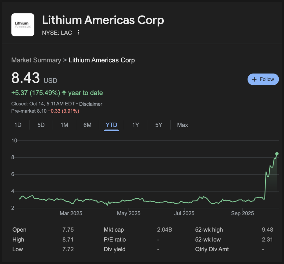 그리고 미국 정부 지분 투자 소식이 나오자 리튬 아메리카(Lithium Americas) 주가는 급등했고,