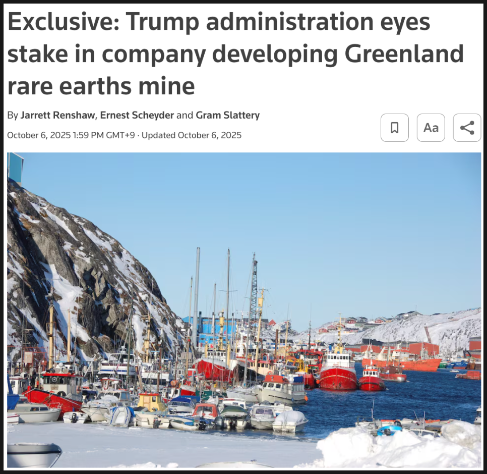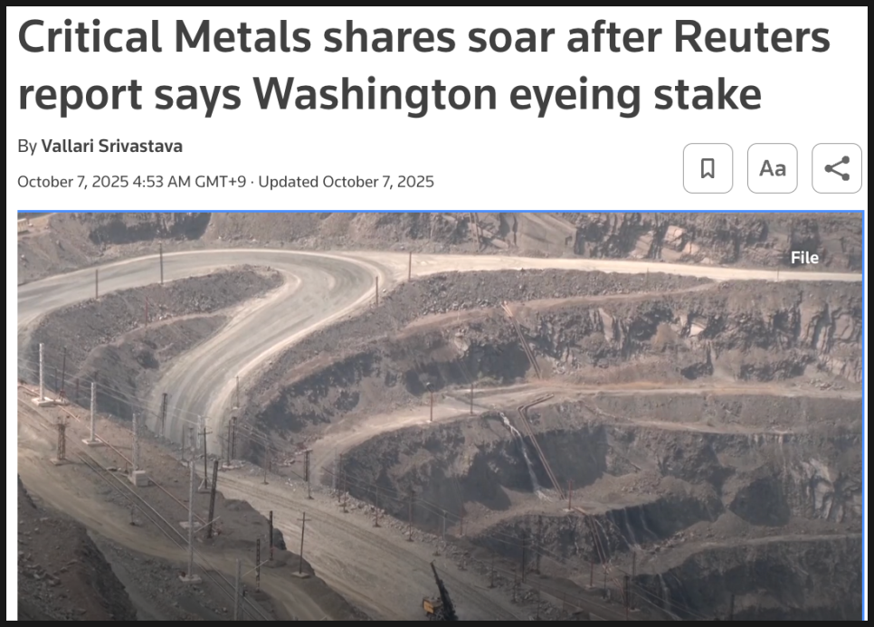 이제 왜 이 회사가 갑자기 엄청 뜨게 됐는지 얘기해보겠습니다. 최근 로이터(Reuters) 보도에 따르면, 트럼프 행정부는 Critical Metals에 직접 지분 투자를 검토하고 있습니다. 정부가 민간 광산 기업에 직접 자금을 투입해 지분을 확보하려는 움직임인데요. 재정 지원을 넘어, 미국 정부가 전략적 자산으로 직접 관여하겠다는 신호로 해석됩니다.