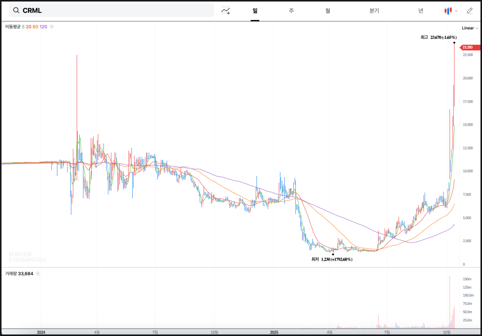 마지막으로 주가 얘기 해보곘습니다. CRML 주가는 2025년 초까지만 해도 1달러대 초반(1.23달러)까지 밀리며 시장의 관심권 밖에 있었습니다. 장기 하락 추세선 아래에서 거래량도 많지 않았고, 뚜렷한 상승 모멘텀도 없었죠. 하지만 7월 이후부터 분위기가 달라지기 시작했습니다. 거래량이 점진적으로 붙으면서 주가가 천천히 3~5달러 구간을 회복했고, 9월 말부터는 본격적인 급등세로 전환했습니다.