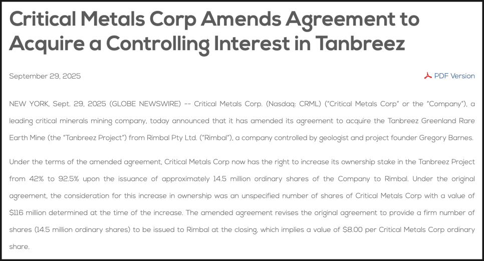 여기에 더해 Critical Metals는 파트너사 Rimbal과의 계약을 변경해 현금 대신 자사 주식을 발행하는 방식으로 Tanbreez 지분을 최대 92.5%까지 확보하기로 했습니다. 단기적으로는 자금 부담을 줄이지만, 주식 발행이 늘어나기 때문에 지분 구조는 다소 복잡해질 수 있습니다.