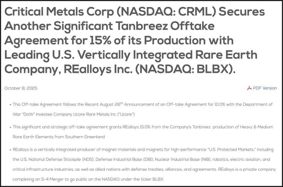 또 최근 크리티컬 메탈스(Critical Metals)는 미국의 희토류 정제 기업 REalloys Inc.와 10년간 Tanbreez 생산량의 15%를 공급하는 계약 의향서를 체결했습니다. 이보다 앞서 Ucore Rare Metals라는 곳과도 10년 공급 계약을 맺었죠. 두 계약을 합치면 약 25%의 생산량이 이미 장기 구매처로 확보된 셈입니다.