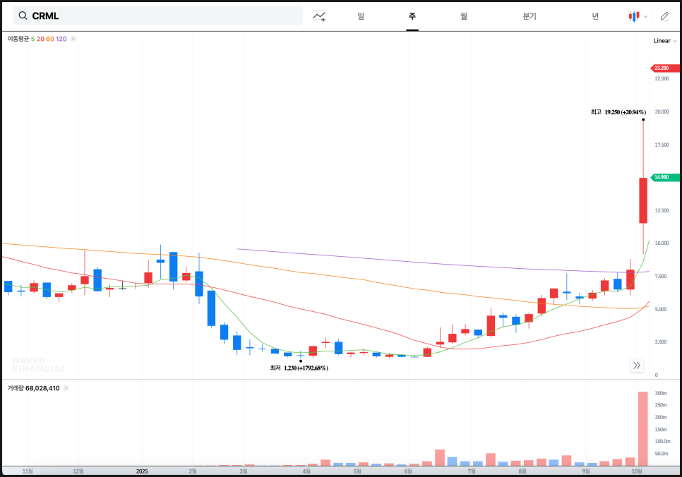 이런 형태는 과거 소외주가 전략 자산이나 테마주로 편입될 때 종종 나타나는 전형적인 움직임입니다. 게다가 이번 상승이 미·중 희토류 전쟁이라는 강력한 테마와 연결돼 있다는 점도 중요합니다. 앞서 언급했듯이, 트럼프의 관세 발언과 중국의 수출 규제 강화가 촉발점이 되었고, 시장은 이를 공급망 이슈와 연결해 CRML을 전략적 수혜주로 인식하기 시작했으니까요.