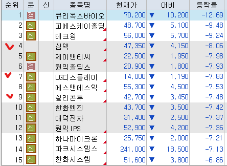 <시총 1조 원 이상 등락률 상위 종목>
