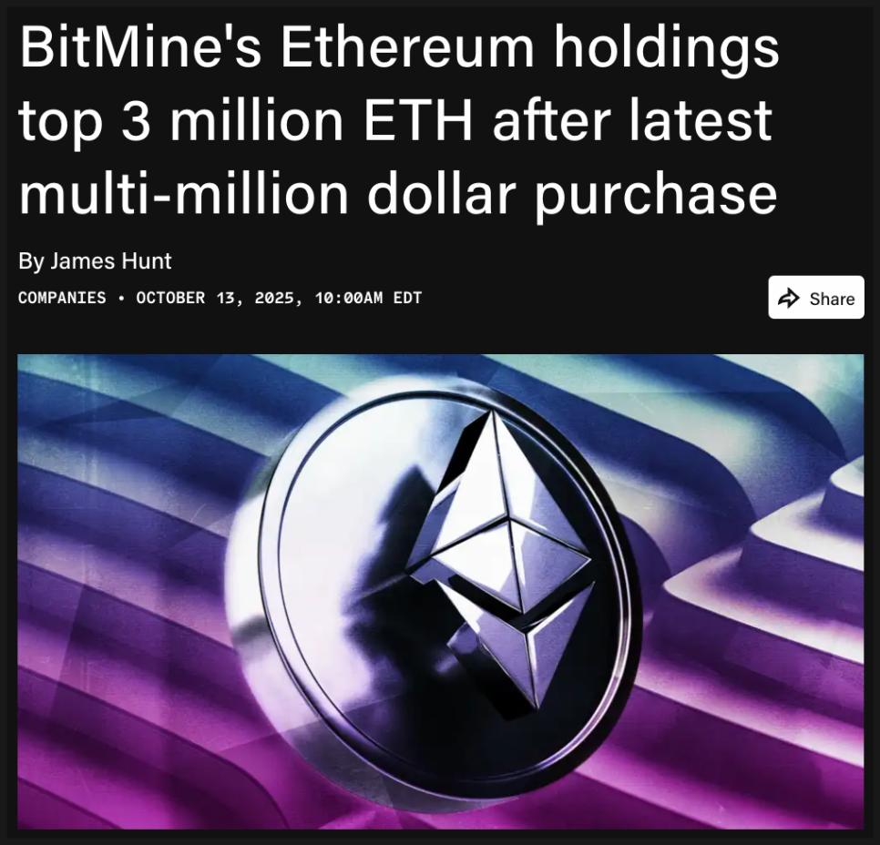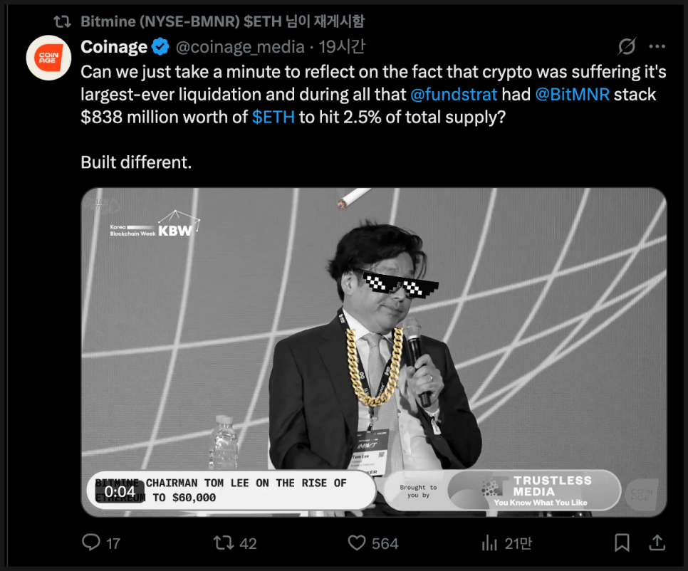 이번에도 10월 6일 이후 약 20만 2,037개의 이더리움을 추가 매수했으며, 이로써 비트마인은 전 세계 최대 이더리움 보유 기업이 되었습니다. 스트래티지에 이어 두 번째로 큰 암호화폐 재무 보유 회사이기도 하죠.