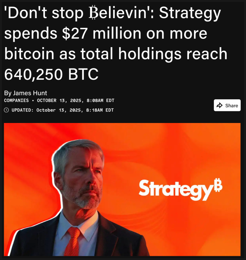 마이크로스트래티지(MicroStrategy)가 사명을 스트래티지(Strategy)로 바꾼 이후에도 공격적인 매수 행보는 계속되고 있습니다. 이번에 스트래티지는 10월 6일부터 12일까지 총 220개의 비트코인을 추가로 매수했습니다. 매입 금액은 약 2,720만 달러, 개당 평균 가격은 12만 3,561달러 수준이었습니다.