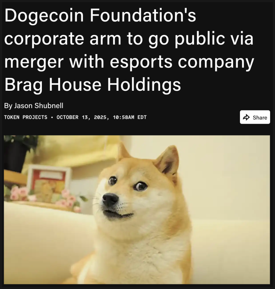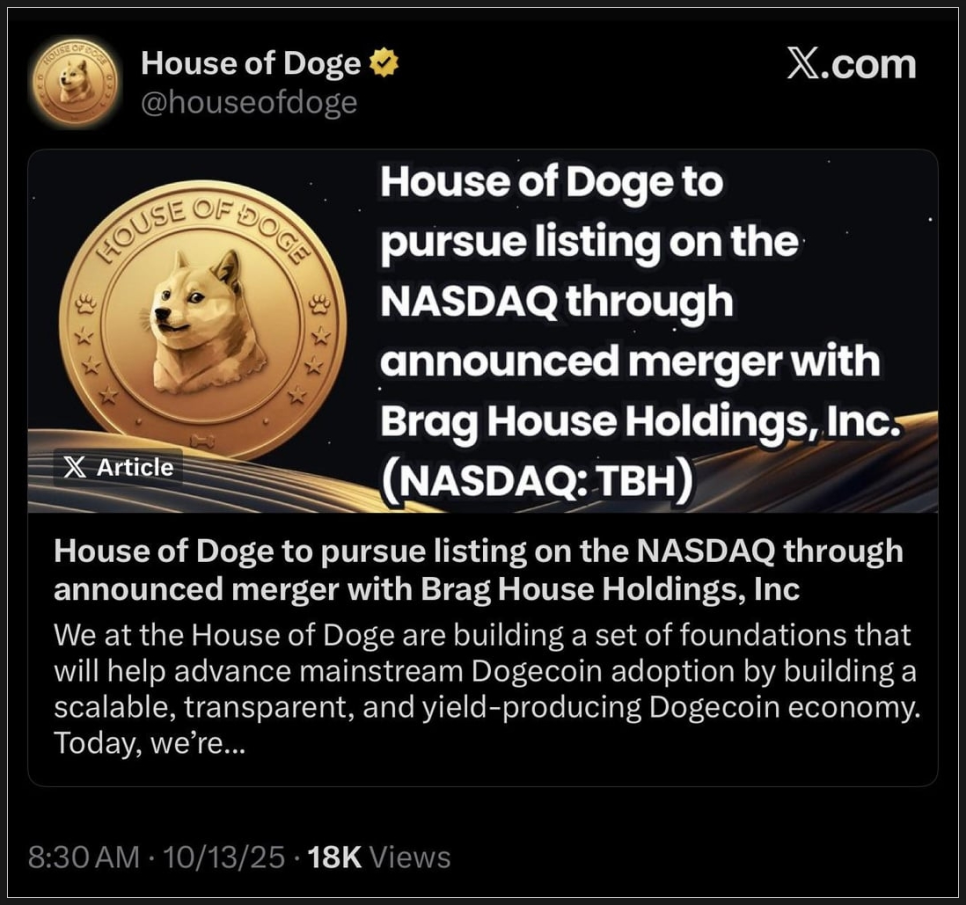 전체적으로 코인 시장 분위기가 흉흉한 와중에 흥미로운 소식도 있었습니다. 도지코인 재단(Dogecoin Foundation)의 기업 부문인 하우스 오브 도지(House of Doge)가 미국 나스닥에 상장된 Brag House Holdings와의 합병을 통해 상장에 나섭니다. 이 소식은 밈코인으로 출발한 도지코인이 점차 ‘실제 금융 생태계’로 발을 넓히고 있다는 점에서 큰 주목을 받고 있습니다.