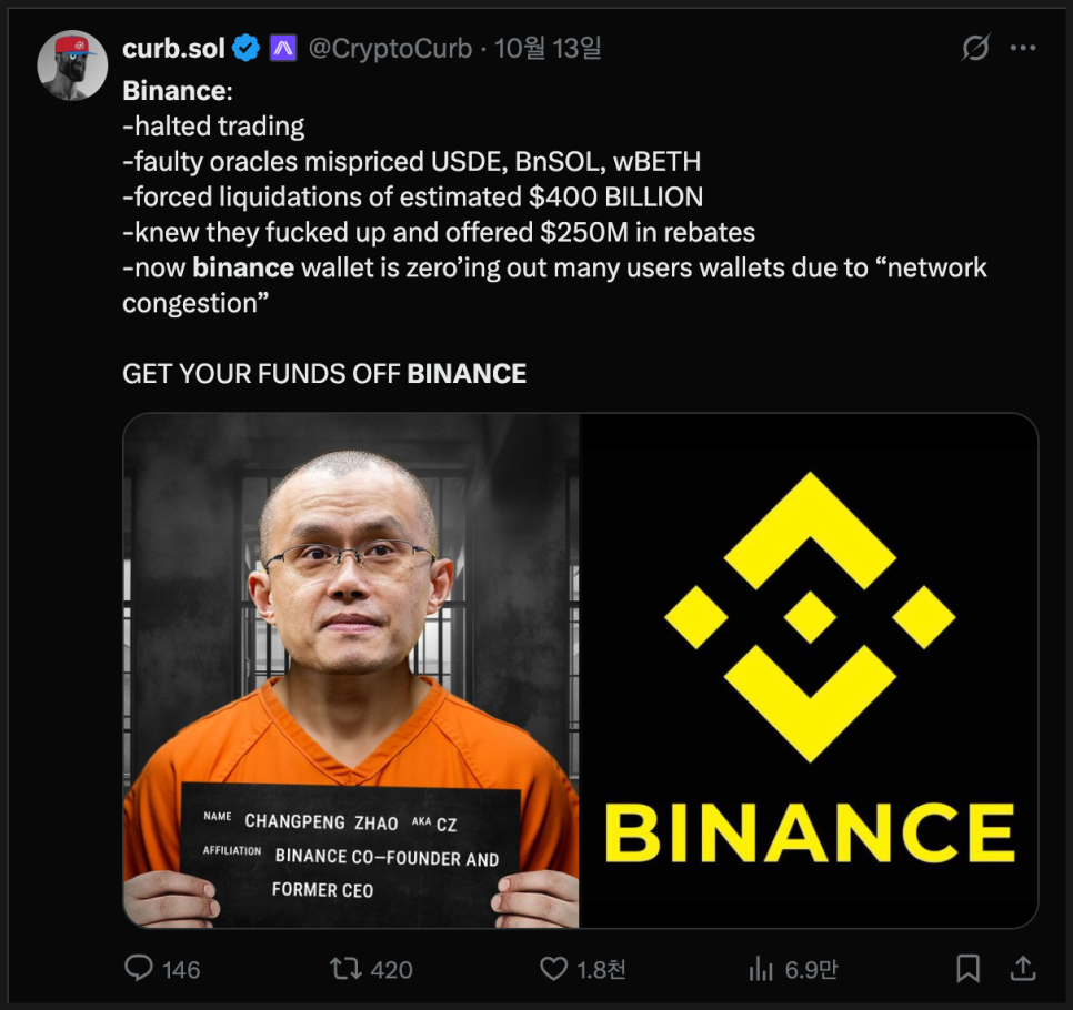 사태 직후 커뮤니티와 SNS에서는 “바이낸스에서 디페깅이 먼저 발생했고, 그것이 시장 전체 폭락을 촉발했다”는 루머가 빠르게 퍼졌습니다. 심지어 일부에서는 “바이낸스에 대한 외부 공격이 있었다”거나 “거래소 내부 시스템에 문제가 생겼다”는 식의 추측까지 제기됐습니다. 다시 말해, 거래소의 문제가 곧 시장 붕괴의 출발점이었다는 루머였죠.