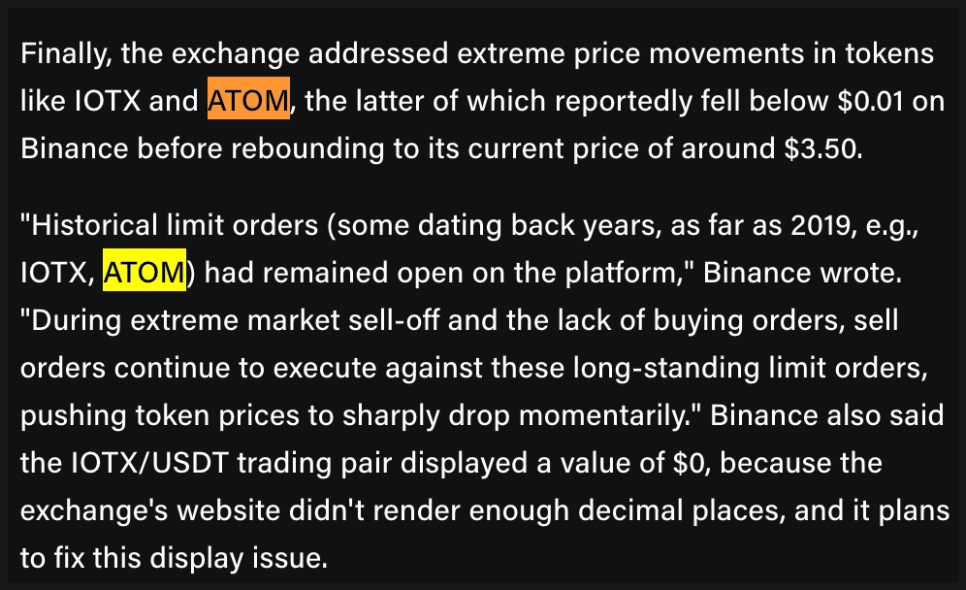또 하나 눈길을 끈 건 ATOM, IOTX 같은 알트코인들의 비정상적인 가격 급락이었습니다. 바이낸스는 일부 토큰의 지정가 주문이 2019년부터 남아 있었고, 급락 당시 유동성이 마르면서 이런 초저가 주문들이 체결돼 가격이 일시적으로 0.01달러 수준까지 떨어졌다고 설명했습니다.