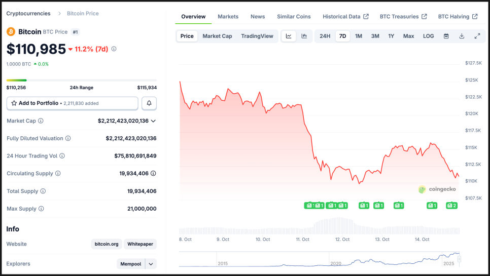 다만 10월 14일 저녁 기준으로 비트코인 가격은 지난 금요일에 찍었던 저점을 위협하고 있습니다. 뭐, 마이클 세일러는 눈 하나 깜짝하지 않겠지만 저점이 무너지면 개인들의 매도세가 강해질 수도 있겠습니다.