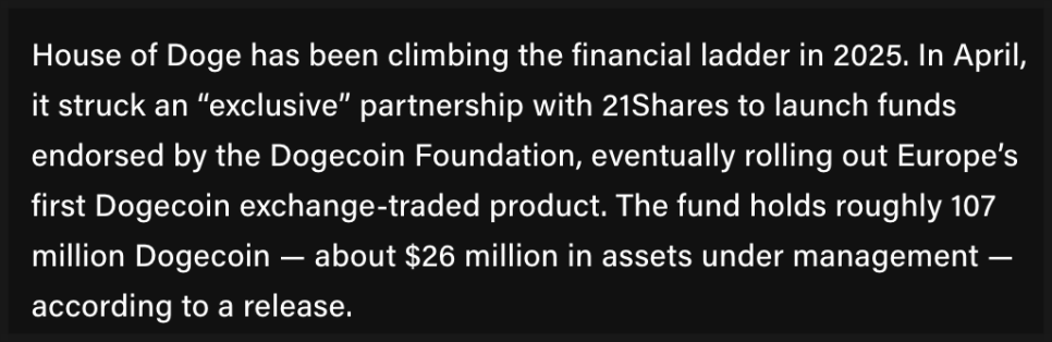 올해 들어 하우스 오브 도지는 금융 생태계에 적극적으로 진입하고 있었는데요. 4월에는 21Shares와 파트너십을 맺고 유럽 최초의 도지코인 상장지수상품(ETF)을 출시했습니다. 해당 펀드는 약 1억 700만 개의 도지코인을 보유하고 있으며, 운용 자산 규모는 약 2,600만 달러에 달합니다.